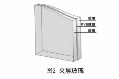 安全玻璃中尤以夾層玻璃以及用夾層玻璃制成的中空玻璃的綜合性能為最佳。夾層玻璃是由兩片或者兩片以上玻璃用合成樹脂粘接在一起而制成的種安全玻璃。夾層玻璃的原片主要是普通玻璃。中間有機(jī)材料最常用的是PVB(聚Z烯醇縮丁醛),也有甲基丙烯酸甲酯,有機(jī)硅,聚氨酯等。當(dāng)外層玻璃受到?jīng)_擊發(fā)生破裂時,破片被膠粘住,只形成輻射狀裂紋,不致因碎片飛散造成人身傷亡事故。夾層玻璃的構(gòu)造如圖2所示。