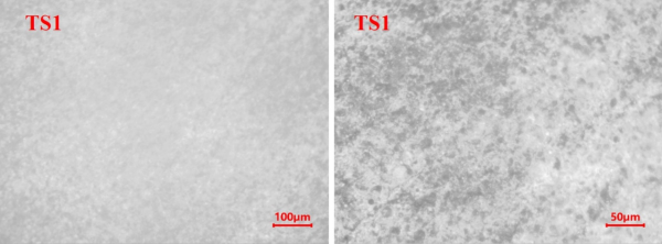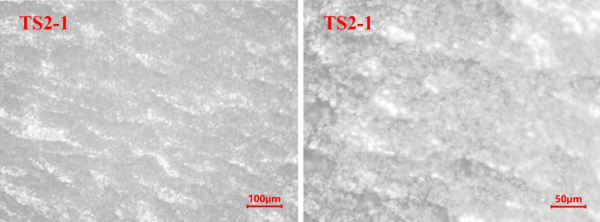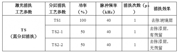 圖3為不同工藝參數(shù)激光清洗得到的晶圓表面顯微形貌,TS1參數(shù)激光清洗后,樣品表面的玻璃層完全去除,露出底部漆層。TS2參數(shù)清洗一遍,得到的晶圓表面有漆層殘留,TS2參數(shù)清洗兩遍,晶圓表面的漆層可以完全清除干凈,露出晶圓基材。激光清洗后需要后續(xù)進(jìn)一步測試,以判斷該晶圓表面狀態(tài)是否滿足生產(chǎn)要求。