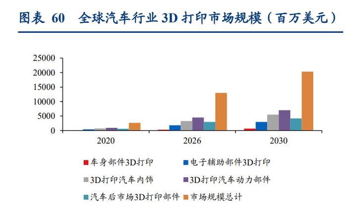 預計 2026 年全球汽車行業(yè) 3D 打印市場規(guī)模將達到 129 億美元。根據(jù) VoxelMatters (formerly 3dpbm)發(fā)布的《3D 打印在汽車行業(yè)的應用市場報告》,預計全球汽車行業(yè)市 場規(guī)模將從 2020 年的 26.78 億美元增長到 129 億美元,復合增長率為 25.28%。汽車主要 由四個部分組成:車身、電子附件、內(nèi)飾和動力部件,其中汽車動力部件的市場規(guī)模占 比最大,2020 年占比為 35.29%。