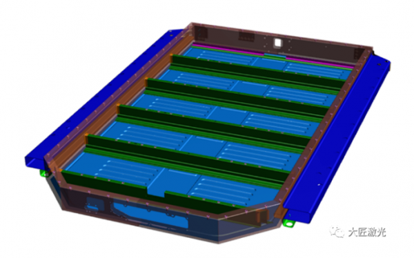 在線激光焊接在新能源高強鋼電池托盤上也有廣泛的應用。在新能源車上,動力電池系統(tǒng)重量占整車18%-30%,而箱體質(zhì)量約占電池包總質(zhì)量的10%~20%。由于電池本身目前的技術(shù)限制,作為動力系統(tǒng)最大的結(jié)構(gòu)件電池包托盤是工程師研究輕量化首當其沖的目標。電池托盤材料主要是高強鋼或鋁合金,但鋁合金托盤成本是鋼制托盤的2-3倍,從材料到成品的碳排量是鋼制托盤的5倍,因此越來越多的廠家開發(fā)先進輕量化的高強鋼和熱成形鋼電池托盤代替鋁合金托盤,并采用輥壓成型、熱成形、激光焊接等先進技術(shù),在提高電池包及車身結(jié)構(gòu)安全性的前提下盡可能降低結(jié)構(gòu)的高度、節(jié)省空間,降低電池包自身重量。