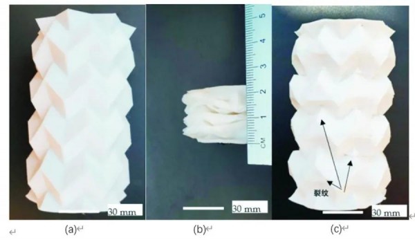 形狀記憶聚合物是一種能記住原始形狀的聚合物,在一定條件下改變其形狀,并能通過施加如熱、電、磁場(chǎng)等刺激,又恢復(fù)到原始形狀的高分子材料。形狀記憶聚合物最常使用的聚乳酸(PLA),也是3D打印中常使用的材料,因此形狀記憶聚合物可以通過3D打印技術(shù)進(jìn)行制作。目前對(duì)于使用3D打印技術(shù)打印形狀記憶聚合物的相關(guān)研究,主要涉及材料的兩方面,一類是使用百分百的純聚乳酸作為形狀記憶聚合物,但由于聚乳酸材料最長(zhǎng)能延長(zhǎng)10%,因此在進(jìn)行打印之前需要對(duì)結(jié)構(gòu)進(jìn)行設(shè)計(jì)以克服這類限制。Langford等使用人字形折紙結(jié)構(gòu)來解決這個(gè)問題,如圖所示。圖(a)是具有人字形折紙結(jié)構(gòu)的3D打印物。