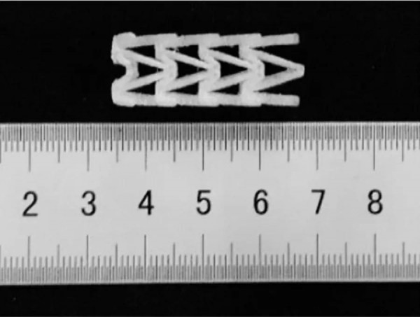 通常PLA長(zhǎng)絲的恒定恢復(fù)率約61%,而人字形折紙結(jié)構(gòu)的恢復(fù)率提升到約96%。另一類是采用聚乳酸復(fù)合材料進(jìn)行3D打印。Guido Ehrmann、Andrea Ehrmann利用FDM 3D打印機(jī),通過將80%的PLA與20%的Fe04混合,形成固體混合物并將其粉碎,然后在雙螺桿擠壓機(jī)中擠壓打印了一種骨小梁多孔結(jié)構(gòu),如圖所示。通過施加30 KHz的交變磁場(chǎng),僅在14~24 s后就達(dá)到了95%以上的形狀恢復(fù)。