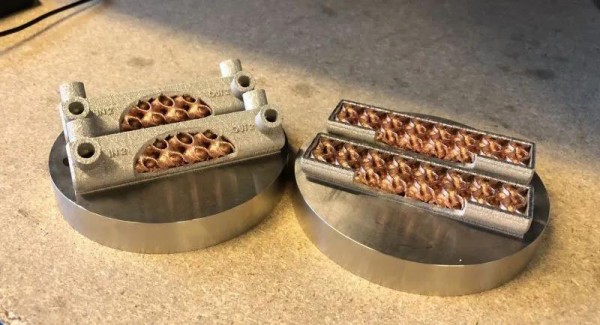 一款采用SLM技術打印的一體化鋼-銅散熱器,由高導熱系數銅合金和結構材料制成的多材料部件在熱管理方面具有廣泛的應用。熱交換器和冷卻元件常用于數據中心、汽車、化學工業(yè)、燃燒裝置、模具、鑲件等。對于注塑行業(yè)來說,冷卻時間的縮短可以加快整個生產周期。對于較小的模具鑲件,隨形冷卻通道的空間非常有限,因此在鑲件內部使用銅材料成為加速散熱的唯一方法。
