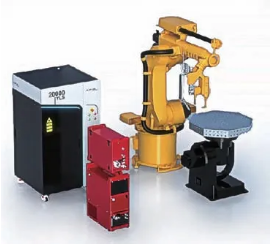 針對船舶制造過程中的平面分段中船板的拼接焊,奔騰激光研發(fā)了高功率激光電弧復(fù)合焊接工藝,適用于船舶拼接焊的小車式激光電弧復(fù)合焊接機、大型龍門激光電弧復(fù)合焊接機等。機器人激光電弧復(fù)合焊接機如圖1 所示。