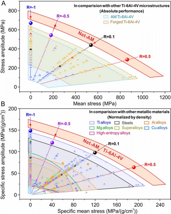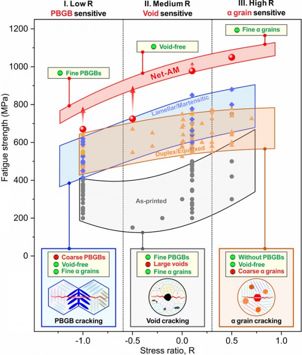 在本項研究中,面對這個更復雜的難題,研究團隊分析揭示出鈦合金中幾種容易導致疲勞開裂的薄弱環(huán)節(jié),以及它們在哪種受力模式下會“發(fā)作”。在此基礎(chǔ)上,研究團隊利用NAMP工藝制造了近乎無孔洞的3D打印組織,可以同時優(yōu)化所有這些薄弱環(huán)節(jié),這種3D打印鈦合金具備在全應(yīng)力比條件下都保持高疲勞強度的特性。