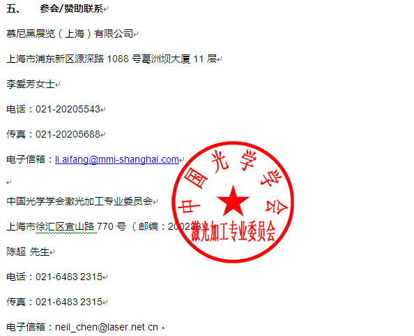 國際應用激光技術(shù)中國研討會作為“光學技術(shù)大會 (PHOTONICS CONGRESS CHINA)”的一部分,每年與慕尼黑上海光博會 (LASER World of PHOTONICS CHINA)同期舉辦。