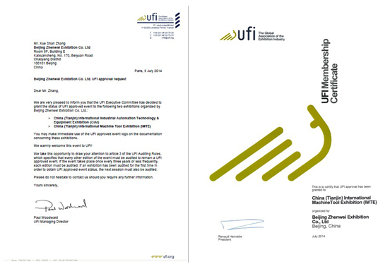 2014年7月,天津機(jī)床展通過(guò)國(guó)際展覽業(yè)協(xié)會(huì)UFI認(rèn)證,成為展覽行業(yè)最高認(rèn)證機(jī)構(gòu)的會(huì)員展會(huì)。這也是天津市繼金屬加工展之后,第二個(gè)通過(guò)UFI認(rèn)證的展會(huì),奠定了天津會(huì)展業(yè)在國(guó)際舞臺(tái)上的地位,提高了天津市在會(huì)展行業(yè)的國(guó)際影響力。