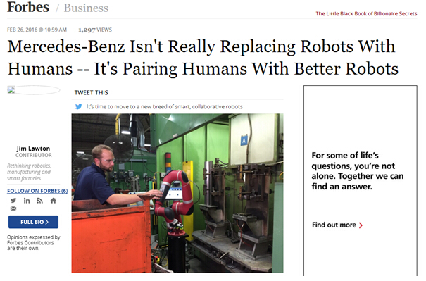 在這個(gè)機(jī)器人大行其道,嶄露頭角的時(shí)代,有人卻反其道而行之!梅塞德斯奔馳,這家有著130年歷史的汽車巨匠企業(yè),近日宣布“解雇”其生產(chǎn)線上的部分機(jī)器人,聘用更有能動(dòng)性、創(chuàng)造性,能自主判斷和處理問題的人類員工來?yè)?dān)當(dāng)諸如奔馳生產(chǎn)車間的一些個(gè)性化裝配服務(wù):碳纖維裝飾,加熱和冷卻杯架,選擇座套顏色,裝配測(cè)試各種車載技術(shù),為輪胎裝配四種不同顏色的輪胎氣門帽這些就不是目前機(jī)器人的“能力”所能代替的。