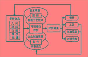 上圖表明,輸入信息是經(jīng)過(guò)處理的設(shè)計(jì)信息模型,核心過(guò)程是對(duì)產(chǎn)品的可制造性評(píng)價(jià),其主要依據(jù)有兩類(lèi):