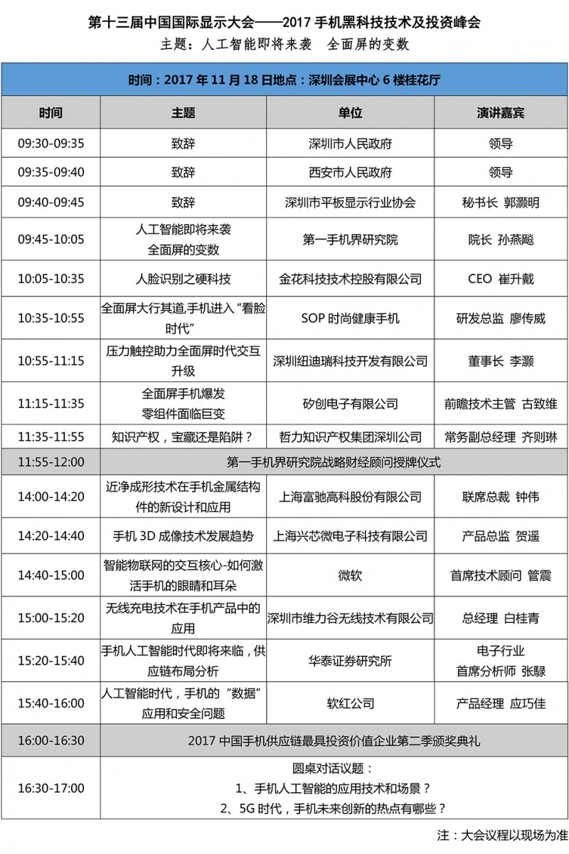 大會第一天日程為顯示峰會和“聯(lián)得裝備”——圓桌高峰論壇兩大部分,屆時工信部電子信息司、深圳市人民政府領(lǐng)導(dǎo)將解讀最新顯示產(chǎn)業(yè)政策、全球顯示產(chǎn)業(yè)學(xué)/協(xié)會負(fù)責(zé)人將到會致辭。同時力邀中、韓、日、臺灣及歐美等國家、地區(qū)的顯示產(chǎn)業(yè)鏈“產(chǎn)、學(xué)、研、政、經(jīng)”各領(lǐng)域領(lǐng)軍人物共話產(chǎn)業(yè)發(fā)展趨勢和應(yīng)用前景。大會第二天日程為“2017手機黑科技技術(shù)及投資峰會”,以“人工智能即將來襲、全面屏的變數(shù)”為主題,峰會分為主題演講、圓桌論壇兩大部分,屆時手機領(lǐng)域的知名專家學(xué)者和領(lǐng)軍企業(yè),將就人工智能及全面屏?xí)r代的到來,給手機產(chǎn)業(yè)帶來的挑戰(zhàn)和機遇進行深度探討,進而推動中國手機產(chǎn)業(yè)占據(jù)人工智能及全屏技術(shù)至高點。