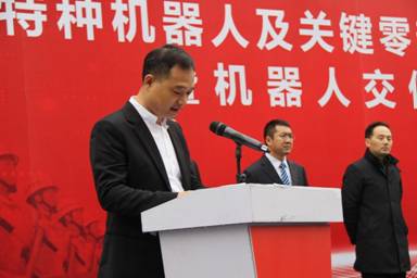 中信重工開(kāi)誠(chéng)智能裝備有限公司總經(jīng)理陸文濤向千人計(jì)劃產(chǎn)業(yè)園管理中心副主任羅浩杰進(jìn)行特種機(jī)器人交付