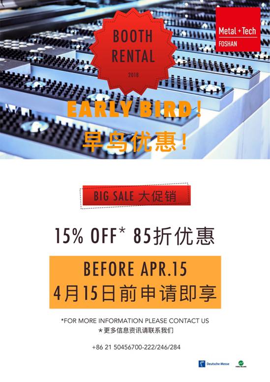即日起至2018年4月15日之間申請(qǐng)展會(huì)即享8.5折優(yōu)惠。(4月15日之后申請(qǐng)展位,一律不享受該優(yōu)惠。)