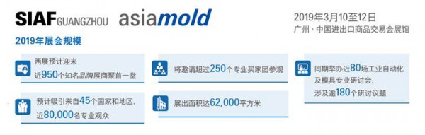 SIAF廣州工業(yè)自動(dòng)化展歷經(jīng)九年磨練,一直處于華南智能制造行業(yè)前沿,促進(jìn)產(chǎn)業(yè)技術(shù)互融與革新,至今已發(fā)展為不可缺席的行業(yè)年度盛會(huì)。2019年SIAF展會(huì)將再度與廣州國際模具展覽會(huì)(Asiamold)同期舉行,于3月10至12日于廣州中國進(jìn)出口商品交易會(huì)展館迎來世界各地的業(yè)內(nèi)人士,展示應(yīng)用領(lǐng)域涵蓋汽車工程、家電制造、電子工程、機(jī)械工程、包裝印刷、消費(fèi)品、照明、紡織品、醫(yī)療器械等,繪畫智能制造的未來藍(lán)圖。