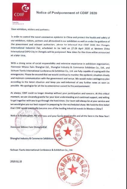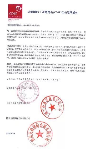 關(guān)于2020成都國際工業(yè)博覽會(CDIIF2020)延期舉辦的通知