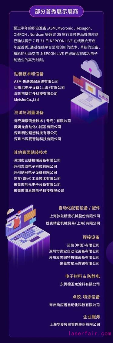超過(guò)半年的積淀準(zhǔn)備,ASM、Mycronic 、Hexagon、OMRON 、Nordson等超過(guò)25家行業(yè)領(lǐng)先品牌供應(yīng)商已確認(rèn)將于7月31日NEPCON LIVE在線(xiàn)展會(huì)開(kāi)啟年度首秀。通過(guò)在線(xiàn)平臺(tái)呈現(xiàn)創(chuàng)新的技術(shù)、 革新的設(shè)備、精彩的互動(dòng)交流,NEPCON LIVE在線(xiàn)展會(huì)將成為電子制造業(yè)的高光時(shí)刻。