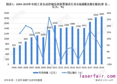 2019 年工業(yè)自動化行業(yè)整體需求較為疲軟,由于中美貿易爭端帶來的不確定性,全年制造業(yè)固定資產投資增速維持在2-3%的低位。19 年OEM 和項目型市場需求的分化,在單產品的市場規(guī)模上也有所反映,19 年國內低壓變頻器市場規(guī)模為203 億元,同比微增0.43%,而伺服和PLC 產品的市場規(guī)模分別為110/113 億元,同比分別下滑5.6%/2%??傮w而言工業(yè)自動化市場規(guī)模已經從2004年的652億元增長至2018年的1830億元,年復合增長率達到7.65%;2019年我國自動化及工業(yè)控制市場規(guī)模達到1865億元,規(guī)模增速繼續(xù)下滑。