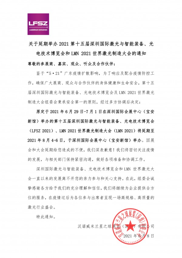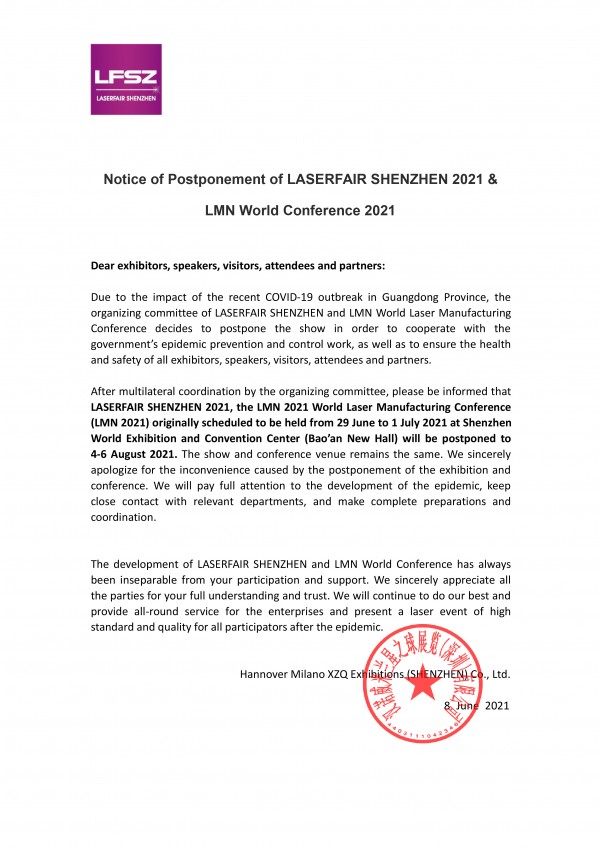 Notice of Postponement of LASERFAIR SHENZHEN 2021 & LMN World Conference 2021