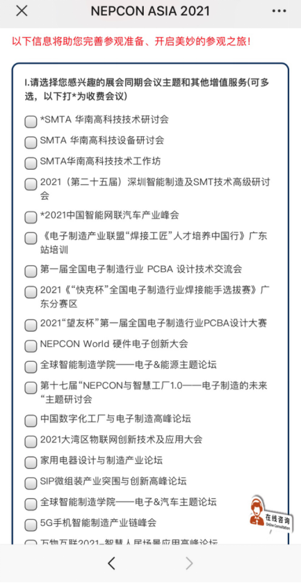NEPCON ASIA 2021已進入開幕倒計時,預(yù)約參觀通道將于10月18日關(guān)閉,掃描文末二維碼,免費預(yù)約參觀,按照步驟完善您的個人信息后,您可以在后續(xù)頁面中勾選您有意向參與的活動(如下圖所示),愿我們的服務(wù)能帶給您美好的參觀體驗!