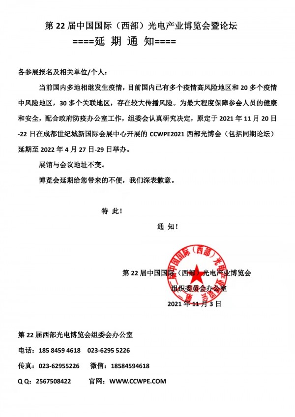 中國(guó)國(guó)際(西部)光電產(chǎn)業(yè)博覽會(huì)(簡(jiǎn)稱:CCWPE或西部光電博覽會(huì))將于2022年4月27日至29日在成都世紀(jì)城新國(guó)際會(huì)展中心舉辦。西部光電博覽會(huì)是目前我國(guó)中西部地區(qū)歷史最長(zhǎng),川渝兩地唯一的光電行業(yè)全產(chǎn)業(yè)鏈年度行業(yè)盛會(huì),自1999年以來(lái),已連續(xù)成功舉辦了二十一屆。