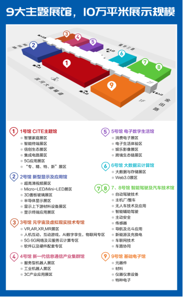 本屆中國電子信息博覽會使用深圳會展中心的全部9個展館,其中1號館為CITE主題館,2號館為新型顯示及應(yīng)用館,3號館為元宇宙及虛擬現(xiàn)實技術(shù)專館,4號館為新一代信息通信產(chǎn)業(yè)集群館,5號館為大數(shù)據(jù)云計算館,7、8號館為智能駕駛及汽車技術(shù)館,9號館為基礎(chǔ)電子館。
