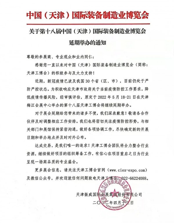 感謝您一直以來(lái)對(duì)中國(guó)(天津)國(guó)際裝備制造業(yè)博覽會(huì)(簡(jiǎn)稱(chēng):天津工博會(huì))的積極參與及大力支持! 近期,新冠疫情已波及我國(guó)30個(gè)?。▍^(qū)、市),目前仍處于嚴(yán)防嚴(yán)控狀態(tài)。為積極響應(yīng)天津市政府關(guān)于當(dāng)前疫情防控工作要求,降低疫情傳播風(fēng)險(xiǎn),經(jīng)審慎評(píng)估,原定于2022年5月18-21日在天津梅江會(huì)展中心舉辦的第十八屆天津工博會(huì)將繼續(xù)延期舉辦。具體時(shí)間另行通知。